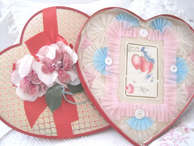 If they weren't beautiful enough on the outside........... when I opened them I got a wonderful surprise! Old crepe paper ruffles!! that frame a vintage Valentine. Toooooo sweet!